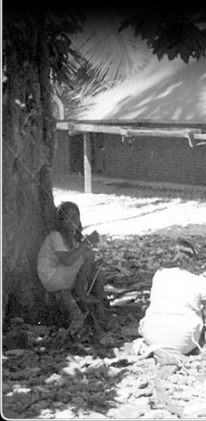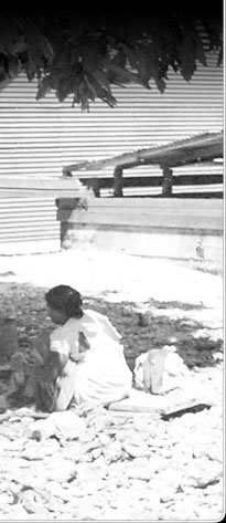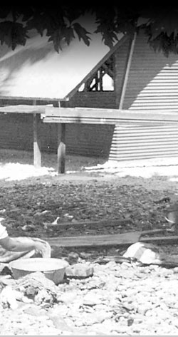 Women wash clothes, with the Ujelang church in the background. The church was the boundary separating the Enewetak people to the south from the original settlers. The Enewetak people adapted quickly to life on Ujelang.