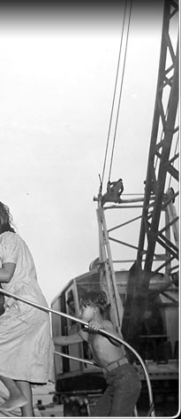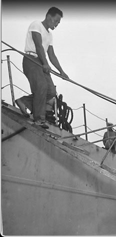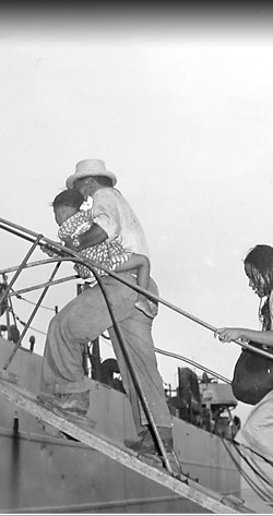 Meanwhile, the Bikini people were on the move once again. Here they board a ship for Kili, an isolated island in the southern Marshalls. In late 1948, they took up residence there-their fourth island home in three years. March 1954.