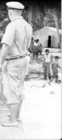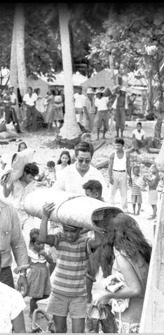 Again, in June 1957, a group of Marshallese are headed to sea. This time it is the Rongelapese boarding the landing craft to return to their own island. US officials judged that Rongelap had "cooled off" enough to be habitable again.