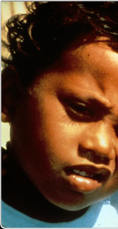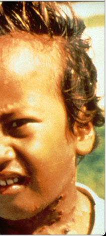 This child's head shows the effects of heavy doses of radiation. Even after the nuclear tests ended in 1958, the results of nuclear fallout began to show up on many Marshallese people.