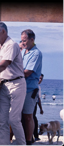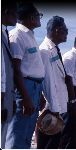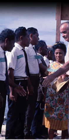 Unhappy with life on Kili, Bikini elders continued to voice their desire to return to their own island. In 1968, permission was granted to return. High Commissioner William Norwood led a party to Bikini to prepare for the resettlement. Here he greets Bikini people at the shore.