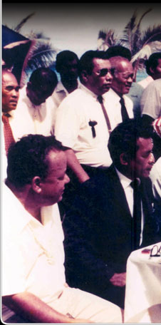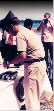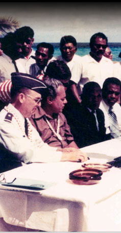Meanwhile, the Enewetak people were making plans to return to their own island. Here Peter Coleman, Deputy HiCom, formally signs over the island from the US military to the Marshalls in 1976.