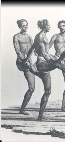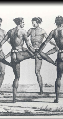 Dancing was one of the oldest and most honored pastimes in the islands. We might not call it a sport, but it certainly performed many of the same functions as sports. In this sketch from the early 1800s we see Carolinians on Guam doing an athletic men’s dance.