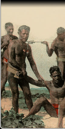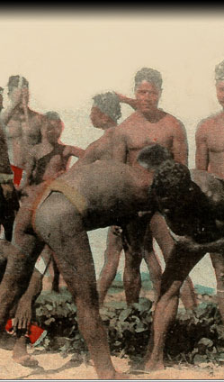 Wrestling was another sport practiced by island people long ago. The Carolinians on Saipan shown here, on a postcard printed by the Japanese much later, are demonstrating the type of holds that had been practiced for centuries.