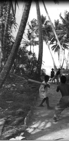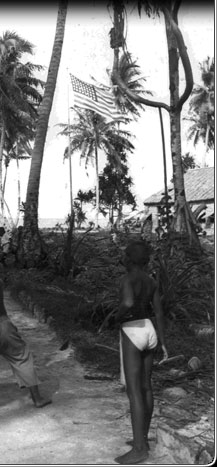 Baseball remained the most popular group sport after World War II. Other things might have changed, but when it came to baseball hardly a beat was missed between the Japanese era and early US days. These Marshallese children are playing outside their school in 1945.