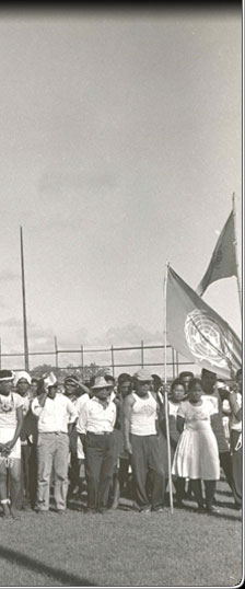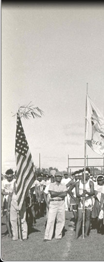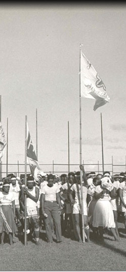 Islanders also retained the hoopla of the track and field days that were such important events before the war. UN Day provided a yearly occasion for island-wide athletic events. Chuukese here gather at the field in 1959 to celebrate the games.