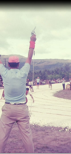 The starter’s hand is raised to signal the beginning of a race at the Micro Olympic Games on Saipan. The Micro Games in 1969 were the earliest of formal inter-island games. They were dropped for a while, but regional games have recently become a yearly event.