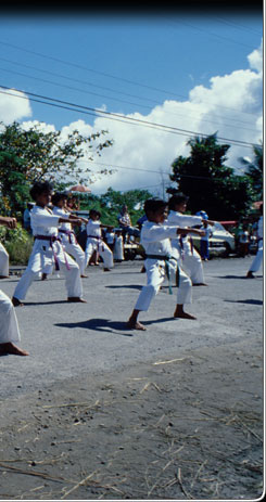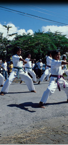 The karate club in Palau is showing their moves during a parade in 1979. Asian sports like karate were brought in by way of the US, just as US baseball had been introduced during the Japanese era.