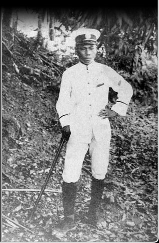 This Yapese policeman cuts a dashing figure in his white uniform. The dress of Yapese policemen had changed greatly in 25 years. For carrying out his duties the policeman received a salary of 25 to 30 yen (about $12 to $15) a month.