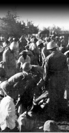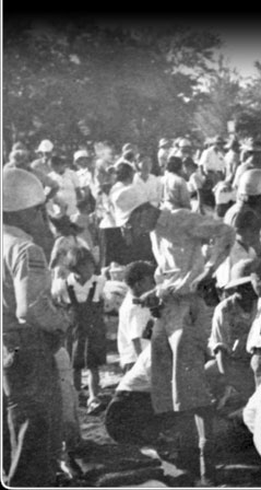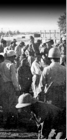 At the end of World War II, local men were recruited by the American military for the new constabulary on Saipan. Here members of the Saipan constabulary check the baggage of Japanese before their repatriation in late 1945.