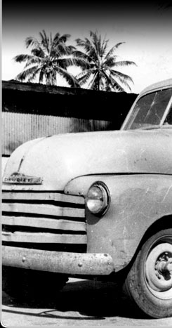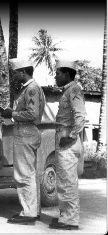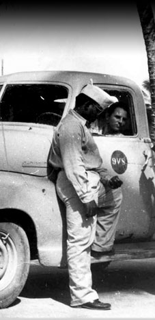 These three Marshallese police on Majuro in 1958 are carrying out a roadside check for driver's licenses. Monitoring traffic was a new role for these early policemen.