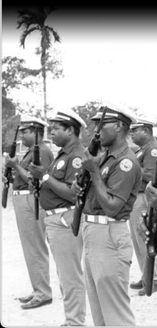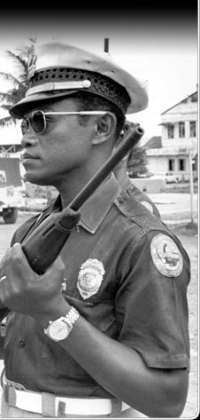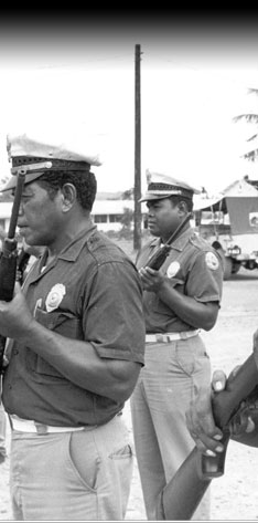The Palauan policemen shown here in 1969 are doing a drill. During the 1960s, uniforms had changed from military to khaki to dark blue, helmets were discarded, and the term "constabulary" was laid to rest.
