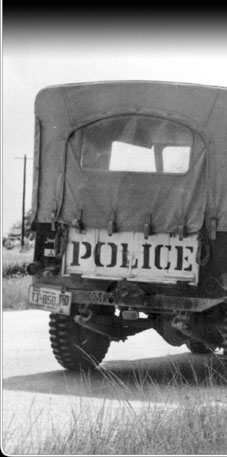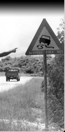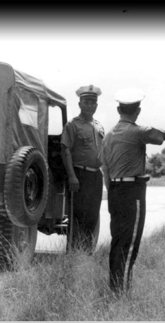 Police inspecting roadside signs on Saipan in 1974. As roads were paved and cars multiplied, policemen found more and more of their time taken up monitoring traffic.