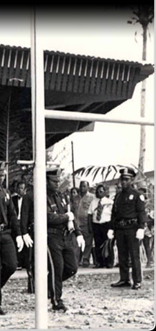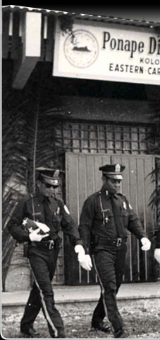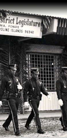 Pohnpeian police march in front of the legislature building in 1975. Just four years earlier on Pohnpei, a policeman was killed while intervening in a drunken bar fight. The growing town populations everywhere presented greater challenges to keeping the peace.