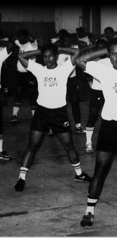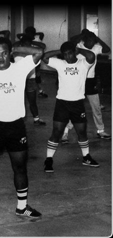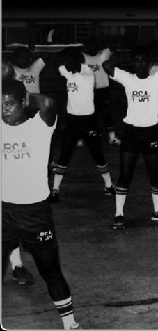 Palauan police cadets in training in 1986 are shown doing their morning exercise. Calisthenics and jogging had become part of the police training program by this time.