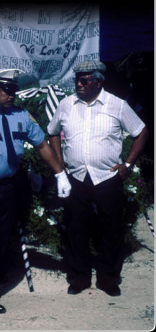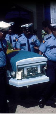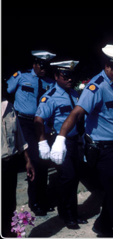 Police in Koror in 1985 are carrying the coffin of Haruo Remeliik, the slain first president of Palau, from the government building in which the body had lain in state to the cemetery.