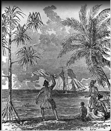 In this sketch from a mission publication, the people of an island are welcoming the "Morning Star" on its yearly visit. This was a familiar scene throughout eastern Micronesia, including the Gilberts, during the second half of the 19th century.
