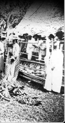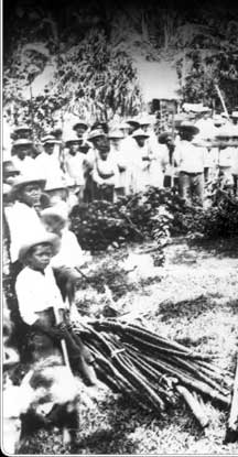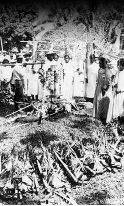 This is Christmas as it was celebrated on Kosrae in the late 1890s. The food laid out on the ground is a gift to the Training School on Mwot from church members of the surrounding villages.