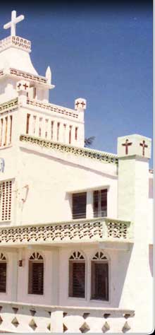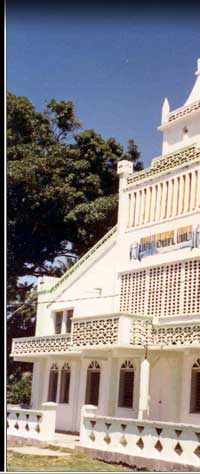 One of the largest churches on Weno is Logan Memorial Church, named after the American who first brought the gospel to that island. The facade of the church is modeled after the Catholic Church in Chalan Kanoa, Saipan.