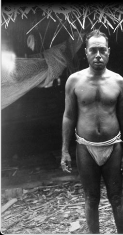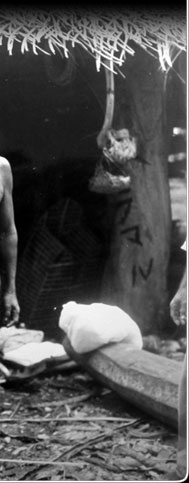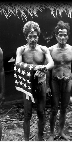 On his trip through the islands in 1946, Admiral Carleton Wright gave each island chief an American flag for display. Here Igifarem, chief of Pigue, stands between two other men with the flag draped over his arm. But the flag wouldn't buy the soap and matches and tools that people needed so badly.