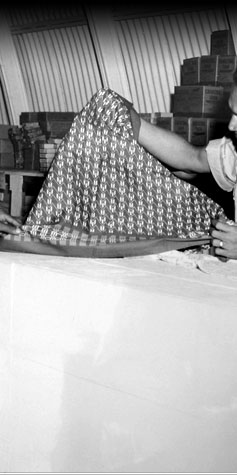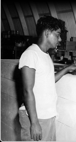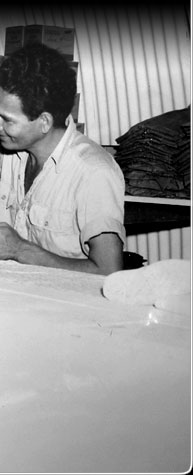Robbie Narruhn, manager of TTC in 1948, is shown here displaying cloth to a customer. In time TTC would add a hardware store, a restaurant and a movie theater to its complex.