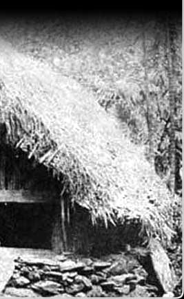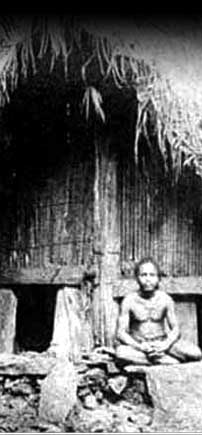 This Yapese priest is sitting in front of a sacred house dedicated to one of the taliu, or vegetation spirits. This spirit, Uthrei, was the patron of yams and sweet potatoes. On the left of the platform is a special seat for the spirit.