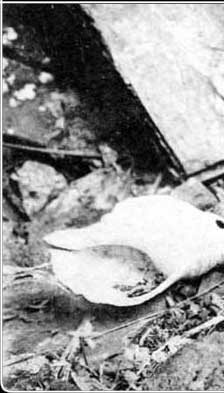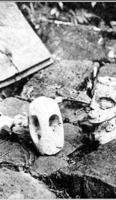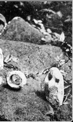Shown here are the objects found in one Palauan spirit house in Airai. These shell objects, probably offerings to the spirit, include a conch shell trumpet, a hammer, a bracelet, and two carved figures.