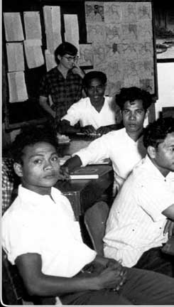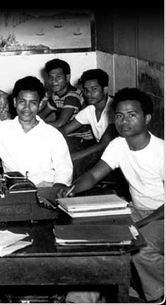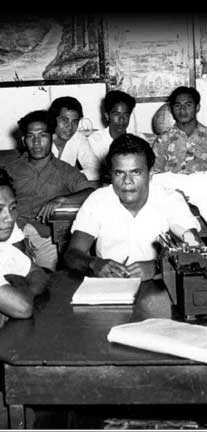 Inside those quonset huts a small number of select students were offered a two-year high school education. These students, some of the best in the Trust Territory, are shown in a math class on the Chuuk campus in 1953. Six years later PICS was moved to Pohnpei.