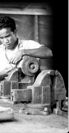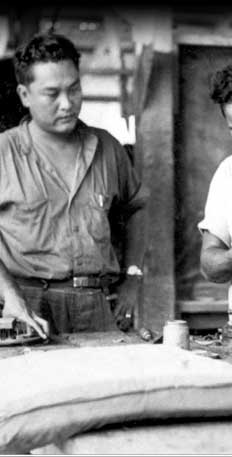 These three Marshallese (Elon Zedkaia, Tamaki Myazoe, and Jirokole Maruto) are working in the auto repair shop of Public Works on Majuro. They are among the new working class of government employees emerging during this period.