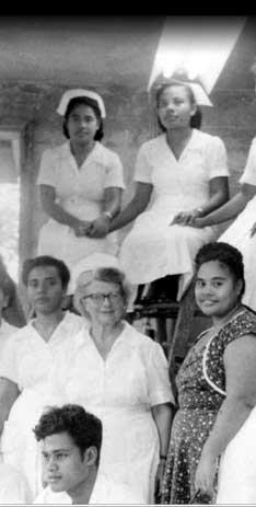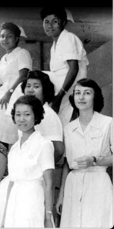 The TT Nursing School in Koror trained young nurses like these, while the Fiji School of Medicine turned out new island medical officers. Ruth Ingram, the instructor, is in the center of the photo. This shot was taken in 1955.