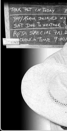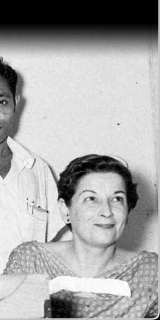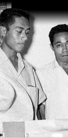 Some young Micronesians were already on the move back then. Daro Weital of Pohnpei and Ichiro Michael of Palau check their travel reservations with Thelma Gorman (later to become Thelma McKenzie).