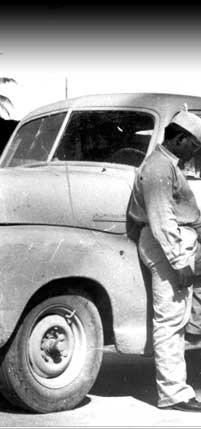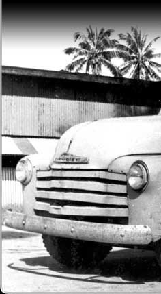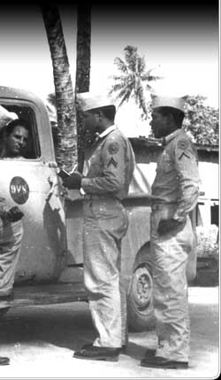 Three Marshallese policemen make a routine check of a driver's license on Majuro in 1958. Though dressed like soldiers, they are members of the Marshalls constabulary.