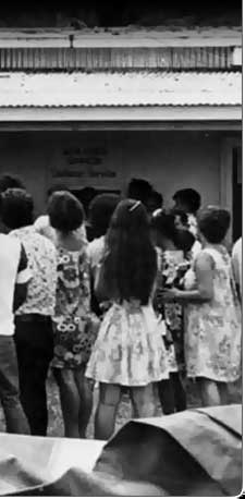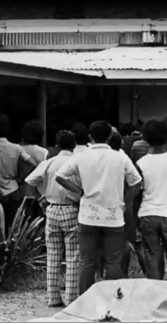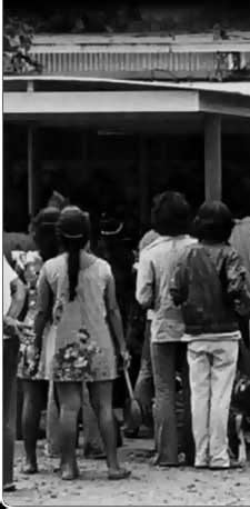 Micronesian women once operated almost entirely behind the scenes. By the 1970s, however, women were beginning to take a more public role in community affairs. Several women can be seen at this protest in front of the Pohnpei Distad's office in 1971 for stronger controls on drinking.